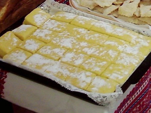 A tojást a porcukorral simára keverjük, majd folyamatos kevergetéssel hozzáadjuk a lisztet, sütőport, olajat, a vizet és ezeket is jól elkeverjük szép simára. A kilisztezett, kizsírozott tepsibe beleöntjük és előmelegített sütőben, lassú tűzön kb. 1 óráig sütjük.